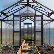 В теплице используется стекло или закалённое стекло, предназначенное для тепличных конструкций. Закалённое стекло проходит термообработку, что повышает его прочность и безопасность. Материал отлично пропускает солнечный свет, не мутнеет со временем и не искажает спектр освещения.